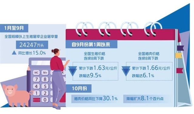 自9月份第1周以來,全國生豬價格連續(xù)8周下跌,累計下跌1.63元/公斤,跌幅達(dá)9.5%;全國豬肉價格連續(xù)8周下跌,累計下跌1.66元/公斤,跌幅達(dá)6.1%。10月份第4周,全國豬肉平均價格25.60元/公斤,比前一周下跌1.2%,同比下跌38.5%。