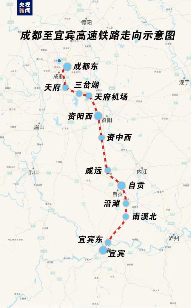成都至宜賓高速鐵路由新建成都東至宜賓東高速鐵路(以下簡稱“成宜高鐵”)和新建重慶至昆明高速鐵路宜賓東至宜賓(以下簡稱“渝昆高鐵宜賓段”)組成。線路北起成宜高鐵成都東站,止于渝昆高鐵宜賓站。成都至宜賓高速鐵路為雙線高速鐵路,全線共設成都東、天府、三岔湖、天府機場、資陽西、資中西、威遠、自貢、沿灘、南溪北、宜賓東、宜賓等12個車站,其中成都東和自貢站為既有站,天府站為緩開站。