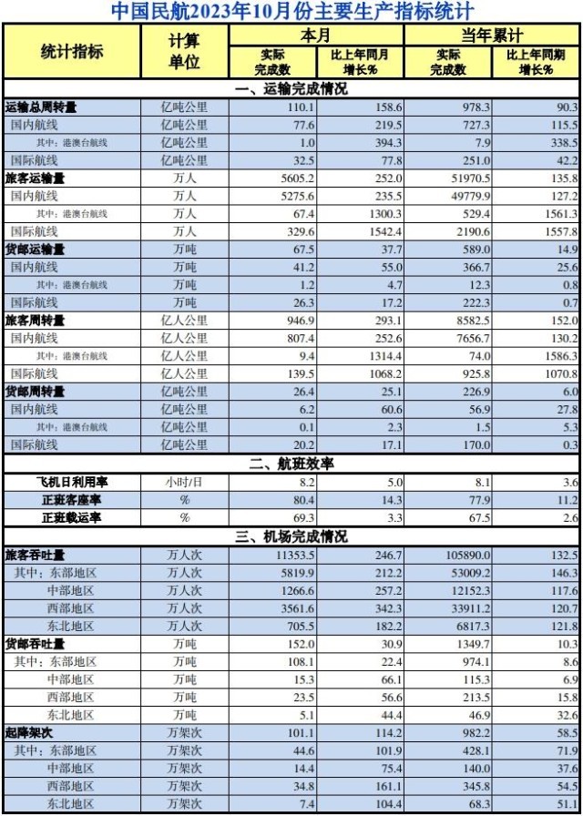 民航局11月20日發(fā)布10月份主要生產(chǎn)指標(biāo)統(tǒng)計(jì)顯示,今年10月,運(yùn)輸總周轉(zhuǎn)量達(dá)到110.1億噸公里,同比增長(zhǎng)158.6%;中國(guó)民航旅客運(yùn)輸量達(dá)到5605.2萬人,同比增長(zhǎng)252%;10月貨郵運(yùn)輸量為67.5萬噸,同比增長(zhǎng)37.7%。