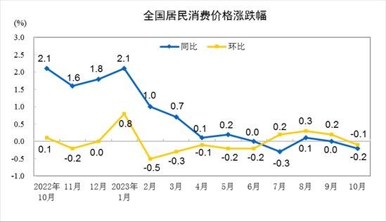 國家統(tǒng)計局?jǐn)?shù)據(jù)顯示,2023年10月,全國CPI環(huán)比下降0.1%,同比下降0.2%,同比時隔兩個月后再度出現(xiàn)負增長。