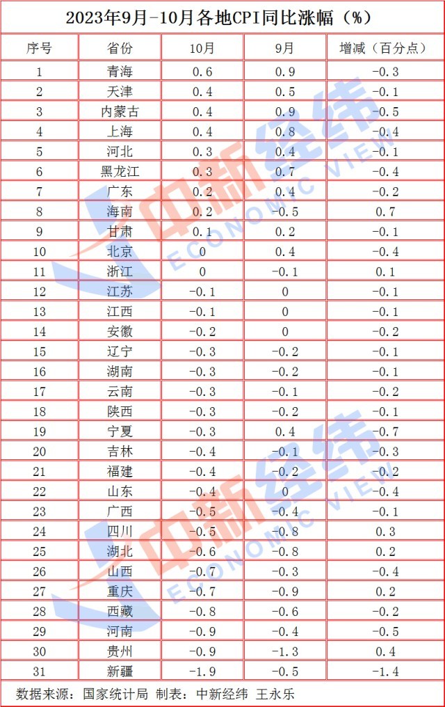 31省份10月CPI出爐:20地物價下降,黔豫晉“七連降”