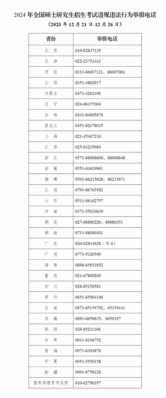 教育部和各省(區(qū)、市)教育招生考試機(jī)構(gòu)將開(kāi)通2024年研考舉報(bào)電話,考生及社會(huì)各界人士可及時(shí)舉報(bào)反映有關(guān)問(wèn)題線索。教育部及各省(區(qū)、市)將會(huì)同有關(guān)部門(mén)根據(jù)舉報(bào)線索第一時(shí)間核查處理,堅(jiān)決維護(hù)風(fēng)清氣正的研考環(huán)境。