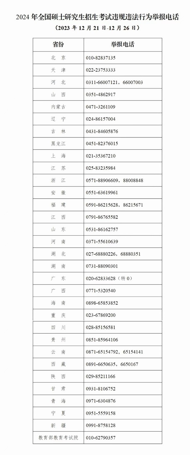 教育部和各省(區(qū)、市)教育招生考試機(jī)構(gòu)將開通2024年研考舉報(bào)電話,歡迎廣大考生及社會(huì)各界人士及時(shí)舉報(bào)反映有關(guān)問題線索。教育部及各省(區(qū)、市)將會(huì)同有關(guān)部門根據(jù)舉報(bào)線索第一時(shí)間核查處理,堅(jiān)決維護(hù)風(fēng)清氣正的研考環(huán)境。