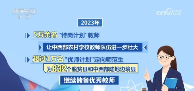 強教必先強師。2023年,5萬余名“特崗計劃”教師讓中西部農(nóng)村學(xué)校教師隊伍進一步壯大,超過1萬名“優(yōu)師計劃”定向師范生為832個脫貧縣和中西部陸地邊境縣繼續(xù)儲備優(yōu)秀教師。