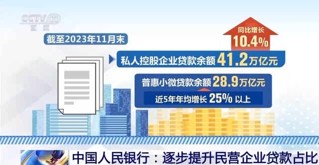 在信貸政策方面,開展中小微企業(yè)金融服務(wù)能力提升工程,完善金融服務(wù)體系,增強(qiáng)民營貸款的穩(wěn)定性。截至2023年11月末,私人控股企業(yè)貸款余額41.2萬億元,同比增長10.4%;普惠小微貸款余額28.9萬億元,近5年年均增長25%以上。