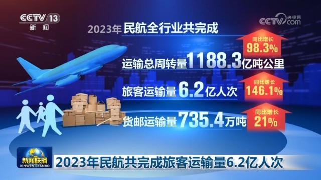 2023年,民航全行業(yè)共完成運輸總周轉(zhuǎn)量1188.3億噸公里、旅客運輸量6.2億人次、貨郵運輸量735.4萬噸,同比分別增長98.3%、146.1%和21%。飛機日利用率8.1小時,同比提高3.8小時;全行業(yè)大幅減虧1872億元。國內(nèi)航線客運規(guī)模在各類交通運輸方式中恢復(fù)速度最快。國際客運航班從年初的每周不到500班恢復(fù)至目前4600余班,增長9.6倍,復(fù)航國家數(shù)量達到疫情前89.2%。