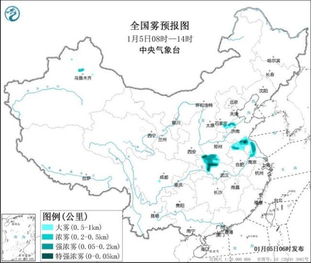 中央氣象臺1月5日06時(shí)繼續(xù)發(fā)布大霧黃色預(yù)警: