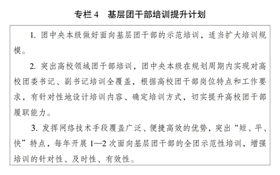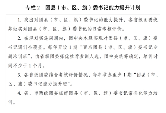 ?。ǘ┩怀觥瓣P(guān)鍵少數(shù)”政治訓練。堅持把政治訓練貫穿團干部成長全周期,使團干部的政治素養(yǎng)、政治能力與擔負的領(lǐng)導職責相匹配。強化“一把手”政治培訓,有計劃地選調(diào)團的各級領(lǐng)導機關(guān)主要負責同志到團干部教育培訓機構(gòu)參加專題培訓。強化對團縣(市、區(qū)、旗)委書記這一群體的培訓,實施團縣(市、區(qū)、旗)委書記能力提升計劃(專欄2)。突出對團的領(lǐng)導機關(guān)干部的政治訓練,各級團的領(lǐng)導機關(guān)加強對機關(guān)干部的常態(tài)化政治能力培訓。加強對青年人才的政治引領(lǐng),團中央組織部會同有關(guān)單位每年組織一定數(shù)量青年人才開展國情研修。積極推動將地方團的領(lǐng)導機關(guān)班子成員培訓納入地方黨委組織開展的干部政治理論培訓范疇。