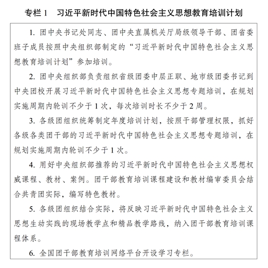 ?。ㄒ唬┚劢咕哿Γ镁脼楣?。完善團干部理論教育培訓長效機制,落實黨的創(chuàng)新理論學習教育計劃,組織實施習近平新時代中國特色社會主義思想教育培訓計劃(專欄1),系統(tǒng)謀劃、持續(xù)用力,不斷把思想鑄魂、理論武裝工作引向深入。堅持把習近平新時代中國特色社會主義思想作為團的各級領(lǐng)導機關(guān)班子成員理論學習中心組學習首要內(nèi)容,作出具體安排、精心組織實施;作為各級團干部教育培訓機構(gòu)的主課必修課,辦好理論進修班、理論研修班;作為團干部學習的中心內(nèi)容,全面系統(tǒng)學、持續(xù)深入學、聯(lián)系實際學。以縣處級及以上團干部為重點,開展習近平新時代中國特色社會主義思想和黨的二十大精神集中輪訓;深入開展主題教育,通過專題學習、研討交流、主題黨課、調(diào)查研究、建章立制等形式,推動黨的創(chuàng)新理論學習教育走深走實走心,使廣大團干部更加深刻領(lǐng)悟“兩個確立”的決定性意義,更加自覺增強“四個意識”、堅定“四個自信”、做到“兩個維護”。深入開展習近平總書記關(guān)于青年工作的重要思想學習培訓,使廣大團干部學習掌握黨的青年工作的地位作用、目標任務、職責使命、實踐要求,為做好新時代新征程黨的青年工作打牢思想基礎(chǔ)。