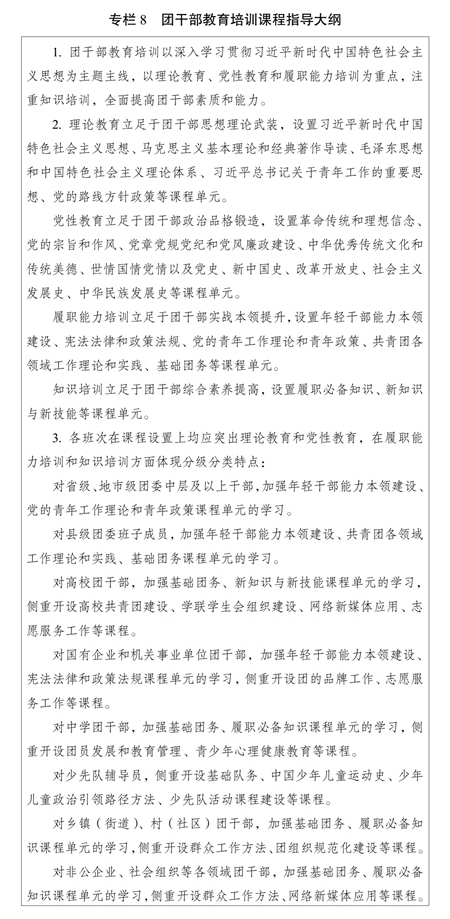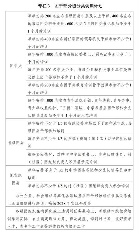 ?。ǘ﹫猿址旨壏诸?。根據(jù)各級團的領(lǐng)導機關(guān)干部、高校團干部、國有企業(yè)和機關(guān)事業(yè)單位單位團干部、中學團干部、鄉(xiāng)鎮(zhèn)(街道)團(工)委書記、村(社區(qū))團組織負責人、非公企業(yè)、社會組織等其他各領(lǐng)域基層團干部的不同對象特點,把團干部履職能力培訓的普遍性要求與不同類別、不同層級、不同崗位團干部的特殊需要結(jié)合起來,整合優(yōu)質(zhì)資源,加強團干部教育培訓機構(gòu)與黨校(行政學院)、干部學院、黨性教育基地等的合作聯(lián)動,多渠道多方面開展履職能力培訓,切實增強教育培訓的時代性、系統(tǒng)性、針對性、有效性。發(fā)揮中央團校、全國青少年井岡山革命傳統(tǒng)教育基地主體作用,圍繞黨的中心任務、黨中央重大決策部署和國家重大戰(zhàn)略需求開展專題培訓;發(fā)揮全國團干部教育培訓基地優(yōu)勢,開展政策解讀、重點任務落實等專題培訓;發(fā)揮地方團干部教育培訓機構(gòu)優(yōu)勢,開展基層團干部實務培訓;發(fā)揮全國團干部教育培訓網(wǎng)絡平臺作用,抓好履職通識培訓;加強與派出單位、接收單位的協(xié)作,抓好援派幫扶干部人才、掛職干部等教育培訓。積極創(chuàng)造條件,支持干部在職自學。實施團干部分級分類調(diào)訓計劃(專欄3)。