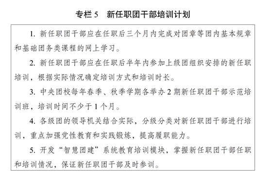 ?。ㄈ┩怀鰧崙?zhàn)實效。強化基層導向,把準培訓需求,加強培訓設(shè)計,選優(yōu)配強師資,綜合運用多種方式方法開展實戰(zhàn)化培訓,實施基層團干部培訓提升計劃(專欄4)。堅持“干而論道”,注重邀請領(lǐng)導干部、專家學者、基層團干部、先進青年典型等授課,讓懂政策的人講政策、有經(jīng)驗的人談經(jīng)驗、會方法的人教方法。團的領(lǐng)導機關(guān)要加強對邊疆地區(qū)、鄉(xiāng)村振興重點幫扶地區(qū)團干部教育培訓支持力度。強化專業(yè)導向,針對青年思想引領(lǐng)、青年統(tǒng)戰(zhàn)、青年外事、青少年權(quán)益維護、“三新”領(lǐng)域、中學等類別團干部和少先隊輔導員開展專題培訓,緊貼業(yè)務實操,加大案例教學比重,把實踐中鮮活生動的案例及時運用到教育培訓中。運用情景模擬、桌面推演、工作復盤等方法,讓團干部在仿真情境中學習如何處理問題、化解矛盾、防范風險。探索把課堂搬到基層一線和普通青年中去,讓團干部在實踐中學習掌握開展調(diào)查研究、密切聯(lián)系青年、做好群眾工作的方式方法,提升解決實際問題的能力本領(lǐng)。加強案例開發(fā)和實訓室建設(shè)。實施新任職團干部培訓計劃(專欄5)。