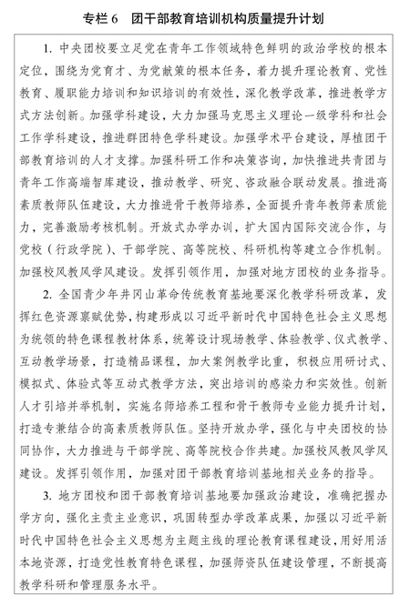?。ㄒ唬┡嘤枡C構(gòu)建設(shè)。加強團干部教育培訓機構(gòu)規(guī)范管理和質(zhì)量提升,推進各級團校、團干部教育培訓基地建設(shè),構(gòu)建以中央團校、全國青少年井岡山革命傳統(tǒng)教育基地為龍頭,各級團校、團干部教育培訓基地相互補充、布局合理、規(guī)范有序的培訓機構(gòu)體系,強化中央團校對地方團校的業(yè)務指導,不斷提高辦學水平。加強各類團干部教育培訓機構(gòu)規(guī)范管理,開展團干部教育培訓機構(gòu)辦學質(zhì)量評估。支持各地各級團組織聯(lián)合開展培訓,鼓勵團干部教育培訓機構(gòu)開展區(qū)域協(xié)作交流,推動優(yōu)質(zhì)培訓資源共建共享。實施團干部教育培訓機構(gòu)質(zhì)量提升計劃(專欄6)。