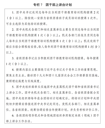 (二)師資隊伍建設(shè)。加大名師培養(yǎng)引進力度,把團干部教育培訓師資納入各級青年人才政策支持范疇,努力造就一批對黨忠誠、精通黨的創(chuàng)新理論、授課水平高、在學科領(lǐng)域有影響力的知名教師。加強師資隊伍黨性教育和業(yè)務培訓,完善專職教師通過列席會議、基層調(diào)研、掛職鍛煉等方式促進知識更新、加深理論研究。通過“名師帶徒”等方式,加強中青年骨干教師培養(yǎng)。大力推進團干部上講臺,實施團干部上講臺計劃(專欄7)。注重在領(lǐng)導干部、先進青年典型、優(yōu)秀基層團干部中遴選培養(yǎng)師資。分級建設(shè)師資庫。探索建立符合團干部教育培訓特點的師資隊伍考核評價體系。