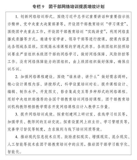 ?。ǘ┘訌娋W(wǎng)絡培訓課程建設(shè)。鼓勵團干部教育培訓機構(gòu)開發(fā)精品網(wǎng)絡課程。注重把握網(wǎng)絡教學特點和規(guī)律,改進授課方式,提高制作水平,豐富呈現(xiàn)形式,提升課程質(zhì)量。嚴把網(wǎng)絡課程政治關(guān)、質(zhì)量關(guān),規(guī)范講授、制作、審核、發(fā)布和更新、退出流程。充分發(fā)揮網(wǎng)絡培訓優(yōu)勢,推動優(yōu)質(zhì)資源下基層。用好網(wǎng)絡直播培訓形式,增強現(xiàn)場體驗感。實施團干部網(wǎng)絡培訓提質(zhì)增效計劃(專欄9)。