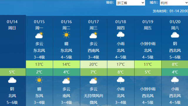 像是杭州,今天最高氣溫22.6℃,剛刷新當(dāng)?shù)?月中旬最高氣溫紀(jì)錄,明天氣溫陡降,雖預(yù)報(bào)最高氣溫14℃,但今晚開始?xì)鉁氐钩觯瑢?shí)際明天下午最高氣溫將不足10℃,17日氣溫再度升至20℃,大幅偏高,20日又降至8℃。