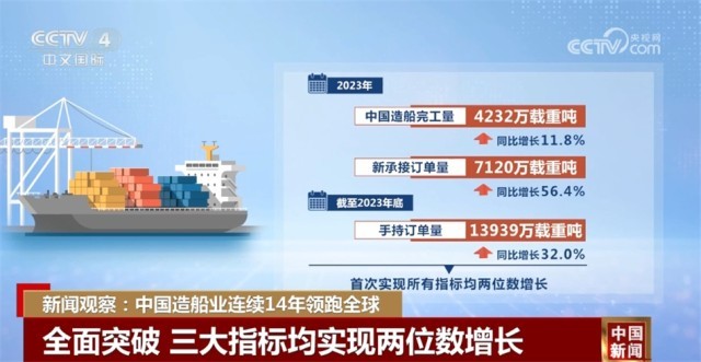 工業(yè)和信息化部1月15日發(fā)布的最新數(shù)據(jù)顯示,中國造船業(yè)三大指標(biāo)連續(xù)14年位居世界第一,成為全球唯一一個三大指標(biāo)實現(xiàn)全面增長的國家。2023年實現(xiàn)了船海產(chǎn)品全譜系總裝建造能力的新成就。新的一年,中國造船業(yè)加快多元化發(fā)展,將向機械化、綠色化、數(shù)字化轉(zhuǎn)型,向著更多船舶細分市場進軍。