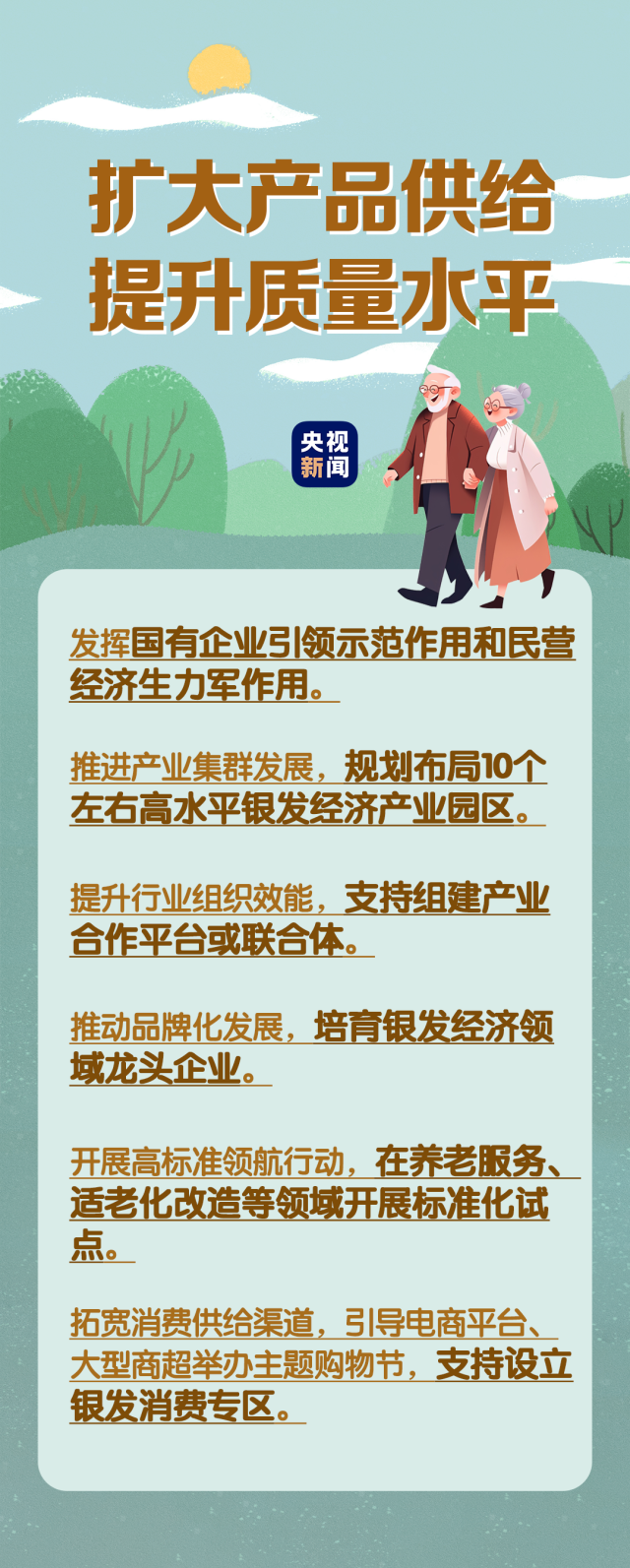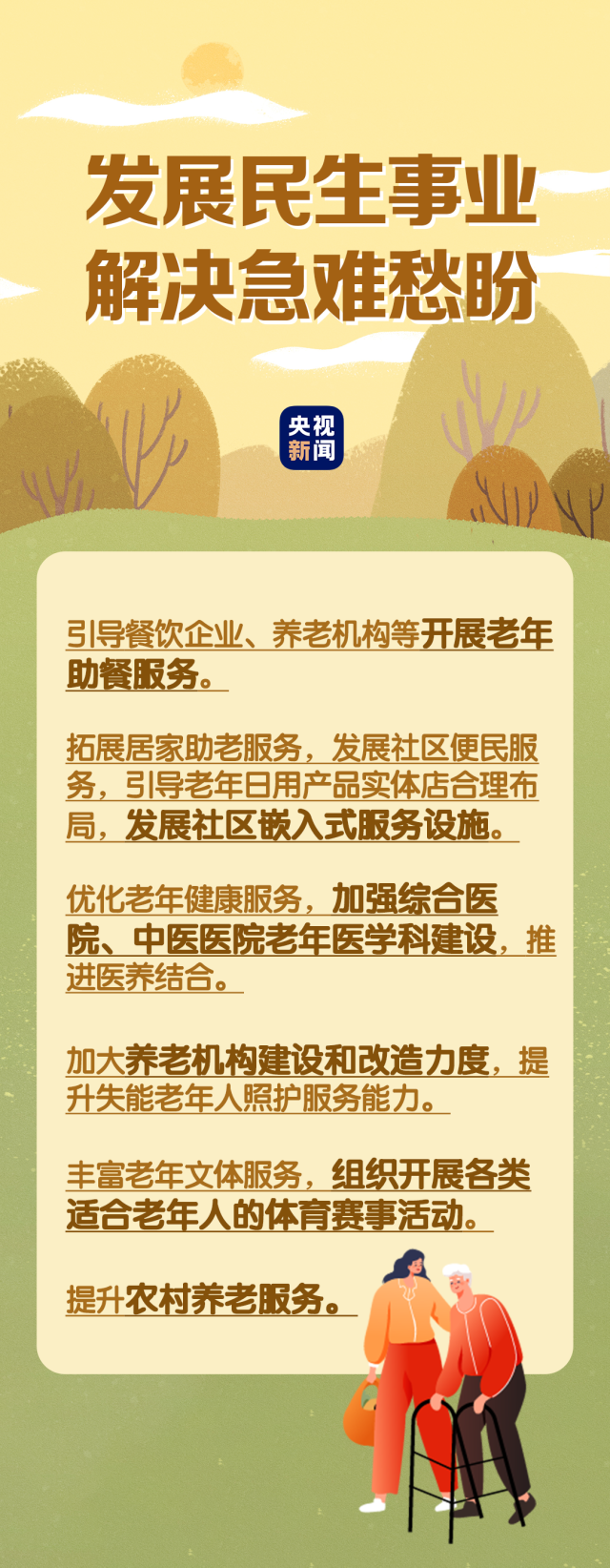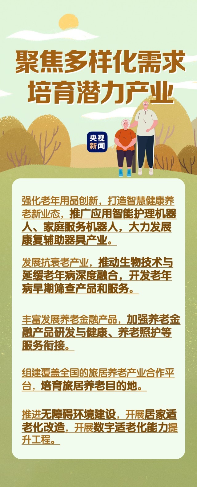 在民生事業(yè)方面,國家將擴大和發(fā)展七方面的服務,包括養(yǎng)老助餐、居家助老、社區(qū)便民、老年健康、養(yǎng)老照護、老年文體、農村養(yǎng)老等方面的服務。國務院辦公廳印發(fā)《關于發(fā)展銀發(fā)經濟增進老年人福祉的意見》中提出了4個方面舉措,小編根據(jù)文件內容進行了簡要梳理,一圖了解“銀發(fā)經濟”核心要點。↓↓↓