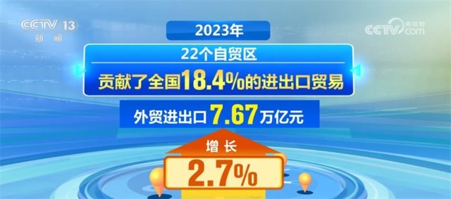 2023年,我國(guó)自貿(mào)試驗(yàn)區(qū)擴(kuò)容至22個(gè)。22個(gè)自貿(mào)區(qū)貢獻(xiàn)了全國(guó)18.4%的進(jìn)出口貿(mào)易,外貿(mào)進(jìn)出口7.67萬億元,增長(zhǎng)2.7%。