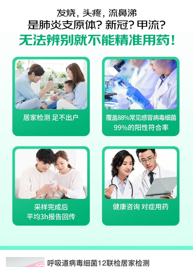“一次檢測,覆蓋92種常見病原體和11種耐藥基因……”相比之下,有機構(gòu)推出的呼吸道病原體居家檢測似乎更加“高大上”。從介紹來看,檢測內(nèi)容包含甲流、乙流等30種RNA病毒、肺炎支原體等5種非典型病原體、煙曲霉等10種真菌、腺病毒等9種DNA病毒和百日咳鮑特菌等38種細(xì)菌,費用高達998元。