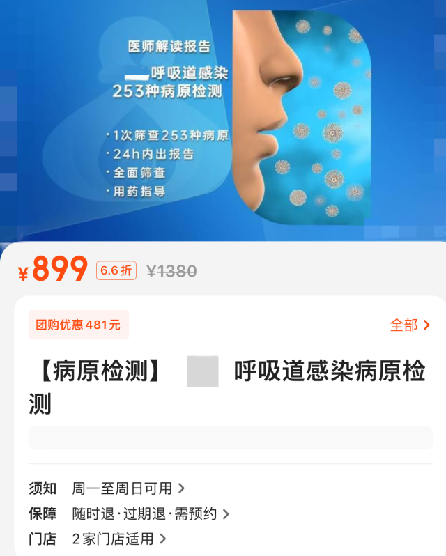 事實上,這并非種類最多的檢測方案。記者在調(diào)查中發(fā)現(xiàn),有機構(gòu)推出的呼吸道感染病原檢測一次篩查病原多達253種,原價1380元,折后也要899元。