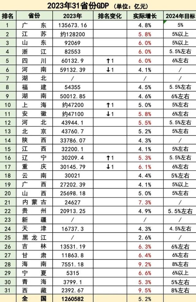 西藏、海南分別以9.5%、9.2%的增速領(lǐng)先,而在已公布數(shù)據(jù)的省份中黑龍江增速較低,為2.6%。值得一提的是,2023年,廣東、山東、四川、湖南等多個省份邁上各自的“萬億”新臺階,江蘇、山東、浙江等經(jīng)濟大省表現(xiàn)亮眼,扛起了增長的大旗。