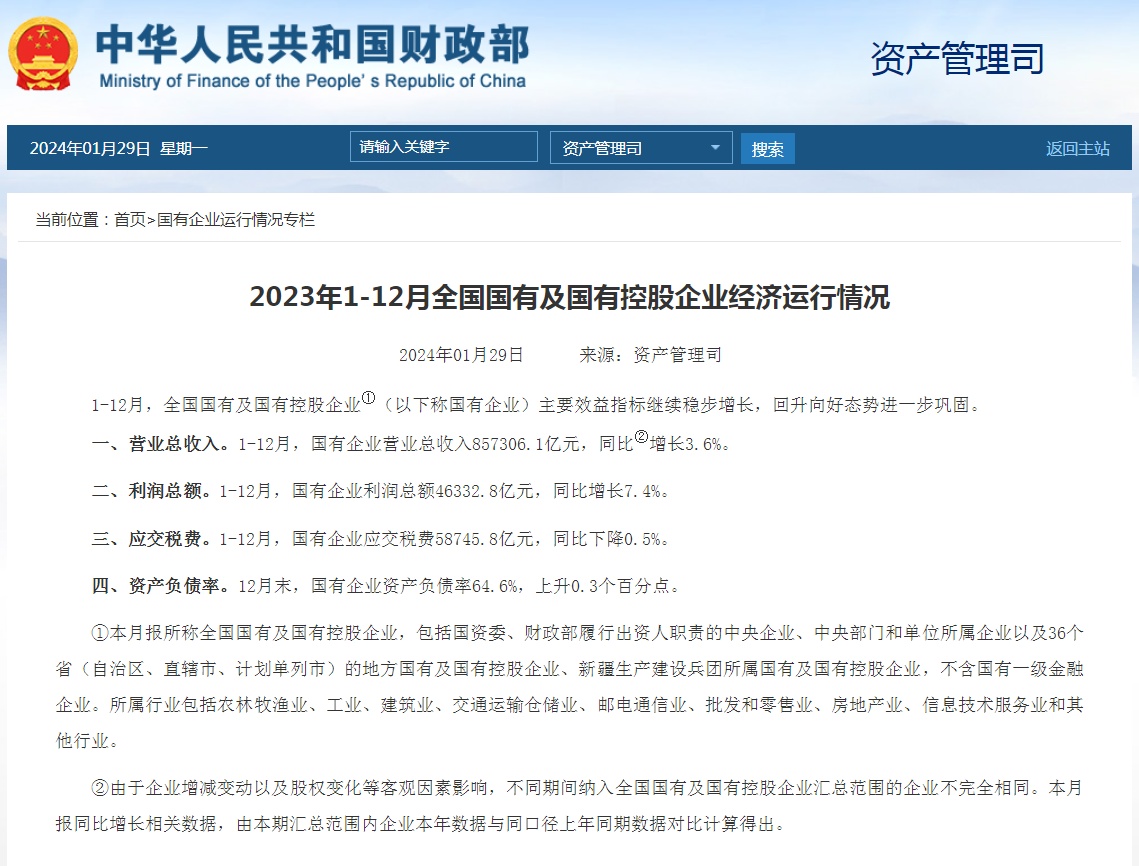 1月29日,財(cái)政部在其官方網(wǎng)站公布2023年1-12月全國(guó)國(guó)有及國(guó)有控股企業(yè)經(jīng)濟(jì)運(yùn)行情況。