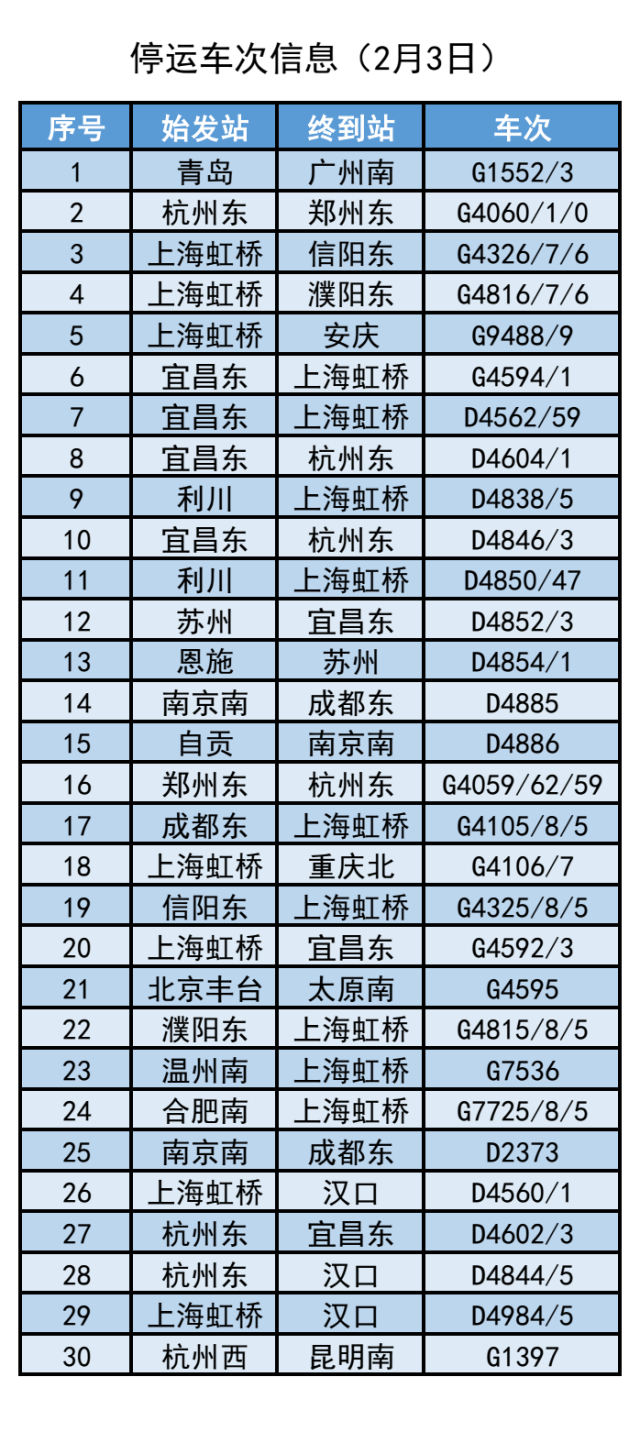 截至2月3日7時(shí)30分,計(jì)劃停運(yùn)2月3日至2月4日間39趟旅客列車(chē)。