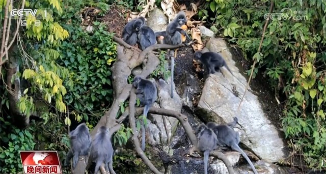 原來爭相帶娃是菲氏葉猴家族獨特的育兒方式。菲氏葉猴聚群而居,每個家庭成員都想和“小金猴”有更多親密接觸。此外,據護林員介紹,這些菲氏葉猴還有著“謙謙君子”的美譽。