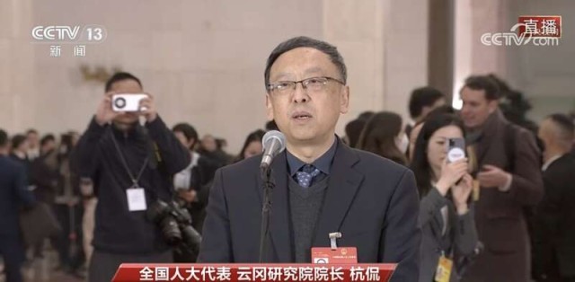 3月5日,十四屆全國人大二次會議首場“代表通道”上,全國人大代表、云岡研究院院長杭侃接受采訪。直播截圖