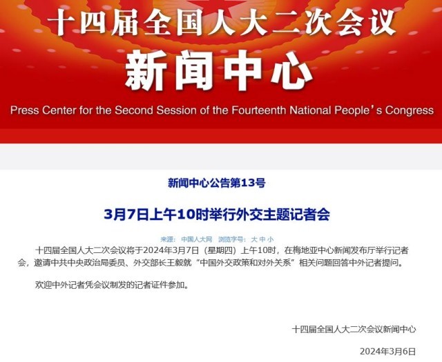 十四屆全國(guó)人大二次會(huì)議將于2024年3月7日(星期四)上午10時(shí),在梅地亞中心新聞發(fā)布廳舉行記者會(huì),邀請(qǐng)中共中央政治局委員、外交部長(zhǎng)王毅就“中國(guó)外交政策和對(duì)外關(guān)系”相關(guān)問(wèn)題回答中外記者提問(wèn)。