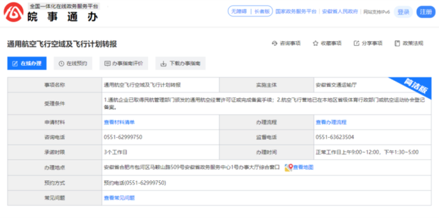 皖事通辦——通用航空飛行空域及飛行計劃轉報