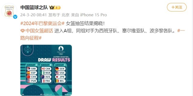 央視網(wǎng)消息:據(jù)中國籃球之隊官方微博消息,2024年巴黎奧運會女籃抽簽結(jié)果揭曉!中國女籃進(jìn)入A組,同組對手為西班牙隊、塞爾維亞隊、波多黎各隊。