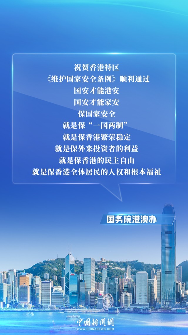 國務(wù)院港澳辦強調(diào),香港國安條例順利通過,為保持香港長期繁榮穩(wěn)定、推動“一國兩制”實踐行穩(wěn)致遠(yuǎn)提供更加堅實的制度保障。香港國安條例全面有效維護(hù)國家安全,充分尊重和保障人權(quán),更好統(tǒng)籌發(fā)展和安全。