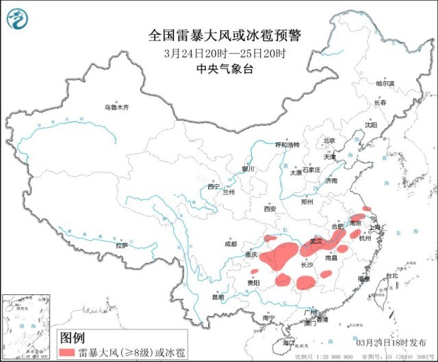 央視網(wǎng)消息:中央氣象臺(tái)3月24日18時(shí)繼續(xù)發(fā)布強(qiáng)對(duì)流天氣藍(lán)色預(yù)警。預(yù)計(jì)3月24日20時(shí)至25日20時(shí),安徽中南部、江蘇中南部、湖北東部和南部、重慶東部、貴州東部、湖南北部和東南部、江西東北部和中南部、浙江西北部、廣西東北部等地的部分地區(qū)將有8-10級(jí)雷暴大風(fēng)或冰雹天氣;安徽中南部、江蘇中南部、上海北部和西部、湖北東部和南部、重慶東部、貴州東部、湖南、江西、浙江西北部、廣西東北部、廣東西北部等地的部分地區(qū)將有短時(shí)強(qiáng)降水天氣,最大小時(shí)雨量20-40毫米,局地可達(dá)50毫米以上。