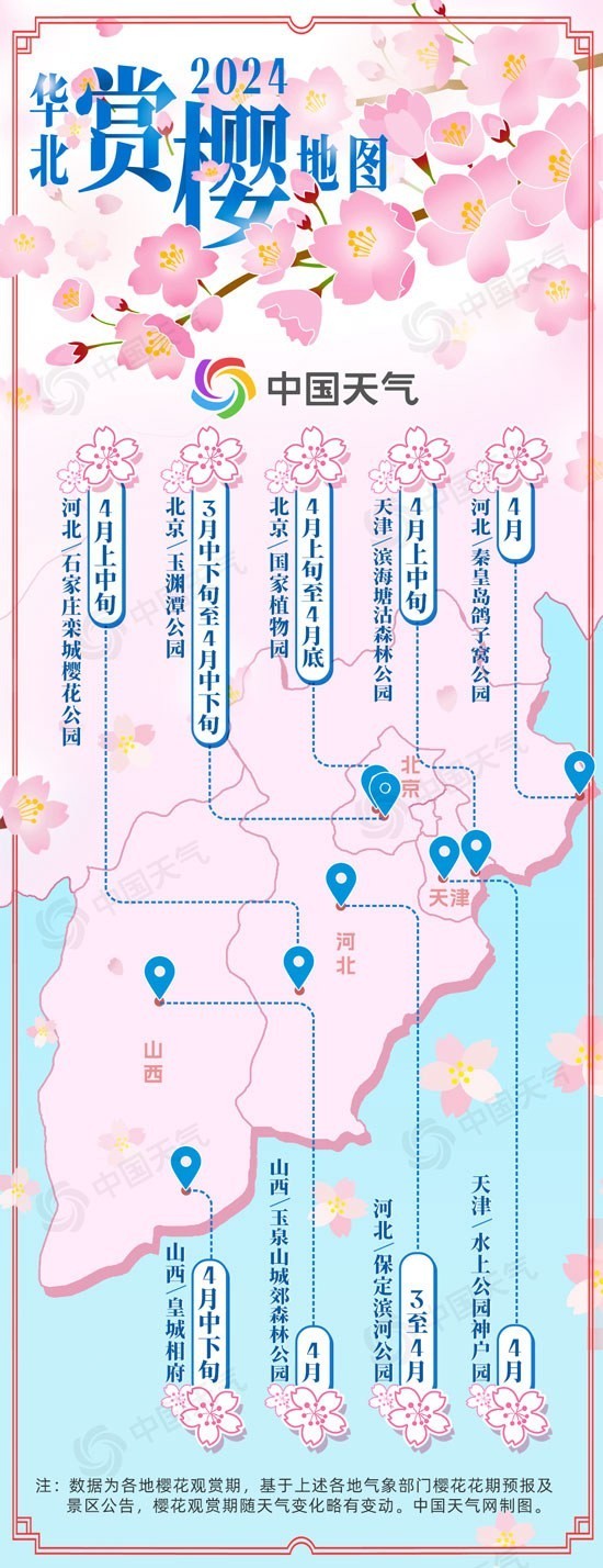 中國(guó)天氣網(wǎng)訊 “層層圍珠璣,團(tuán)團(tuán)錦繡簇?!卑殡S著春天的腳步,華北地區(qū)又迎來(lái)一年中最美的賞櫻季。春日盛景不可負(fù),錯(cuò)過(guò)一季就要再等一年!中國(guó)天氣網(wǎng)推出2024華北地區(qū)賞櫻地圖,賞櫻勝地花期一圖看盡,邀你共赴一場(chǎng)櫻花之約。