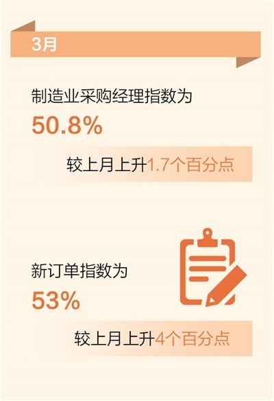 3月,隨著更好支持擴大內需,促進穩(wěn)外貿穩(wěn)外資等政策穩(wěn)定發(fā)力,經濟內生動力不斷釋放,同時外部需求也有所改善,市場需求較好增長。新訂單指數為53%,較上月上升4個百分點,升幅較為明顯;新出口訂單指數為51.3%,較上月上升5個百分點,回到擴張區(qū)間。