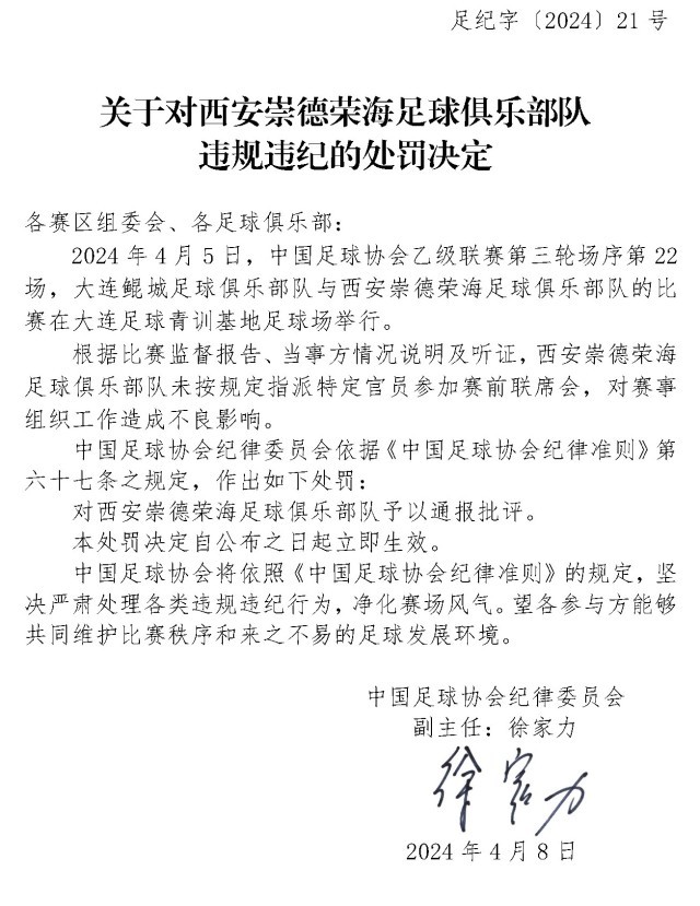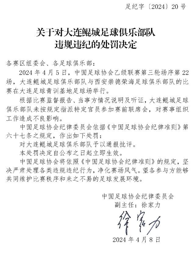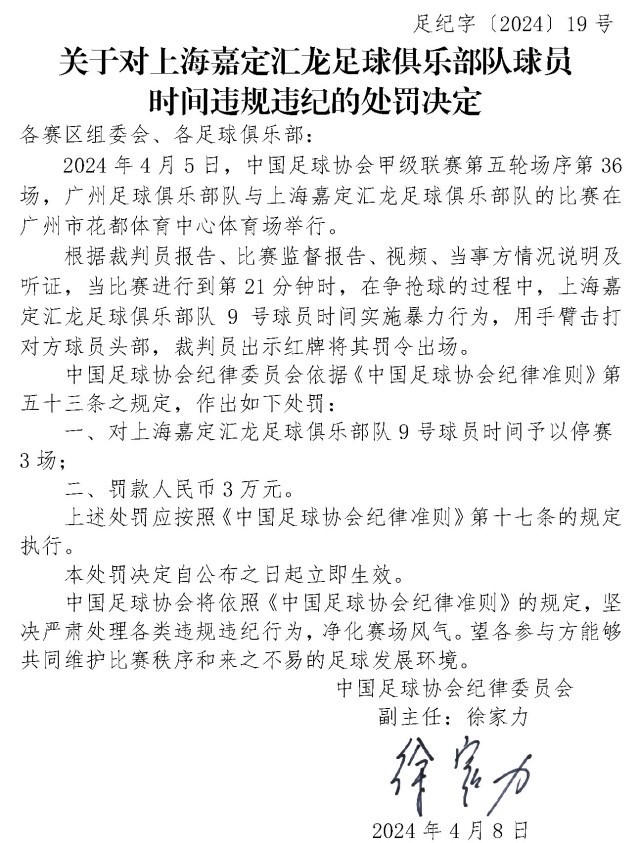 央視網(wǎng)消息:4月10日,中國足協(xié)網(wǎng)站發(fā)布《關(guān)于對上海嘉定匯龍足球俱樂部隊球員時間違規(guī)違紀的處罰決定》《關(guān)于對西安崇德榮海足球俱樂部隊違規(guī)違紀的處罰決定》《關(guān)于對大連鯤城足球俱樂部隊違規(guī)違紀的處罰決定》三份處罰決定。中甲聯(lián)賽上海嘉定匯龍9號球員因暴力行為被停賽罰款。中乙聯(lián)賽大連鯤城與西安崇德榮海兩家俱樂部因未按規(guī)定指派特定官員參加賽前聯(lián)席會,被通報批評。