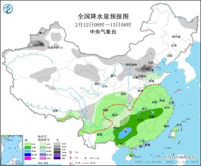 2月12日8時(shí)至13日8時(shí),新疆伊犁河谷和南疆盆地、西藏北部、青海北部、甘肅河西、內(nèi)蒙古中西部、黑龍江北部、陜西北部、華北大部、川西高原南部等地部分地區(qū)有小到中雪,其中,新疆伊犁河谷、河北中部、天津中部等地部分地區(qū)有大雪,局地有暴雪(10~15毫米)。黃淮大部、江淮、江漢大部、江南、西南地區(qū)東部和南部、華南、臺(tái)灣島等地部分地區(qū)有小到中雨,其中,廣西北部等地部分地區(qū)有大雨(25~45毫米)。