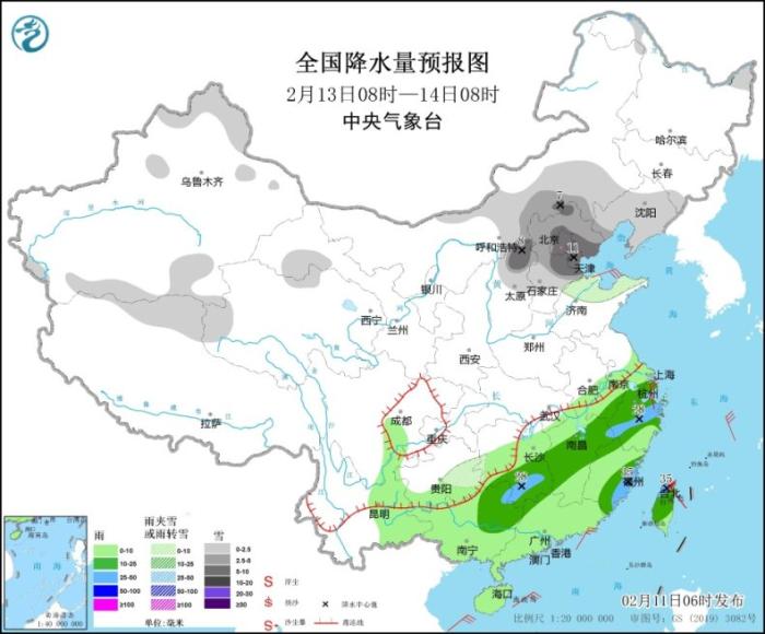 2月13日8時(shí)至14日8時(shí),新疆北部和南疆盆地、西藏北部、青海西部和北部、甘肅河西、內(nèi)蒙古中部、東北地區(qū)南部、華北大部等地部分地區(qū)有小到中雪,其中,山西北部、河北中北部、北京、天津等地部分地區(qū)有大到暴雪(10~11毫米)。江淮西部、江南大部、西南地區(qū)東南部、華南、臺(tái)灣島等地部分地區(qū)有小到中雨,其中,湖南南部、浙江中部、福建東南部、廣西東北部、臺(tái)灣島北部等地部分地區(qū)有大雨(25~35毫米)。