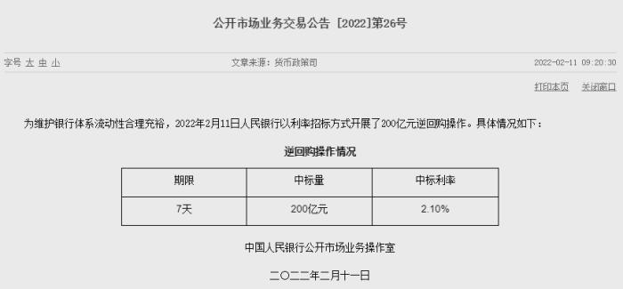 中新財經(jīng)2月11日電 為維護(hù)銀行體系流動性合理充裕,2022年2月11日人民銀行以利率招標(biāo)方式開展了200億元逆回購操作。中標(biāo)利率2.1%,與此前持平。
