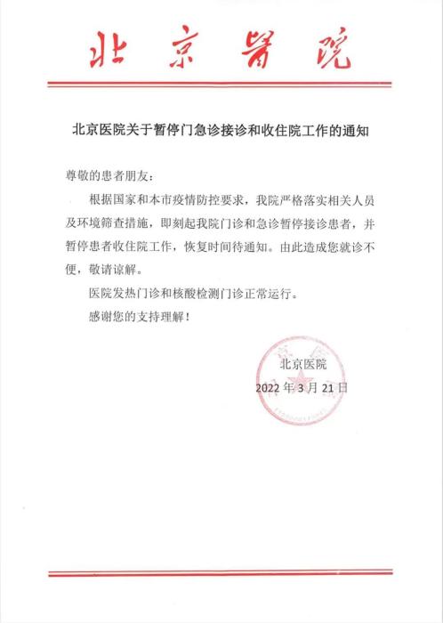 中新網(wǎng)3月21日電 據(jù)北京醫(yī)院微信公眾號(hào)21日消息,根據(jù)國(guó)家和北京市疫情防控要求,該醫(yī)院嚴(yán)格落實(shí)相關(guān)人員及環(huán)境篩查措施,即刻起該醫(yī)院門診和急診暫停接診患者,并暫停患者收住院工作,恢復(fù)時(shí)間另行通知。發(fā)熱門診和核酸檢測(cè)門診正常運(yùn)行。通知如下:
