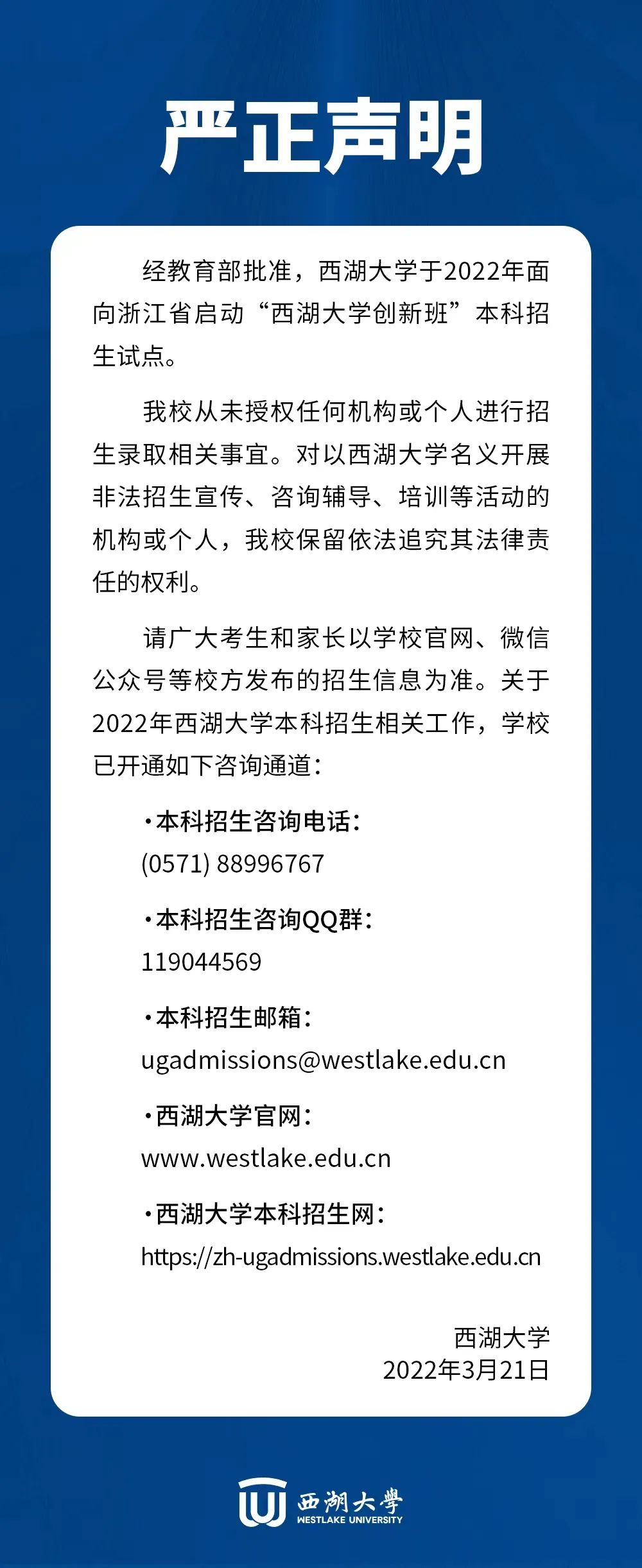 中新網(wǎng)3月21日電 據(jù)“西湖大學(xué)WestlakeUniversity”微信公眾號(hào)消息,3月21日,西湖大學(xué)發(fā)布《關(guān)于2022年西湖大學(xué)本科招生的嚴(yán)正聲明》,聲明指出,經(jīng)教育部批準(zhǔn),西湖大學(xué)于2022年面向浙江省啟動(dòng)“西湖大學(xué)創(chuàng)新班”本科招生試點(diǎn)。該校從未授權(quán)任何機(jī)構(gòu)或個(gè)人進(jìn)行招生錄取相關(guān)事宜。對以西湖大學(xué)名義開展非法招生宣傳、咨詢輔導(dǎo)、培訓(xùn)等活動(dòng)的機(jī)構(gòu)或個(gè)人,該校保留依法追究其法律責(zé)任的權(quán)利。