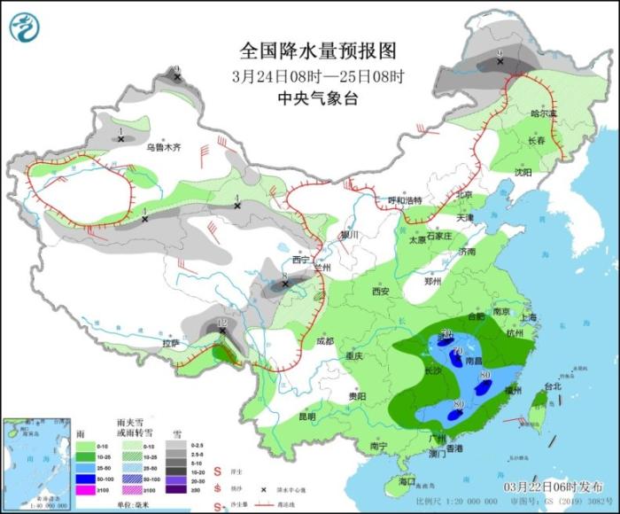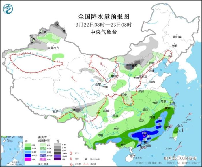 3月22日08時至23日08時,內蒙古中東部、新疆北部、西藏東部、甘肅中部、陜西北部和東南部、山西北部、河北西北部、北京西北部、遼寧西部等地部分地區(qū)有小到中雪或雨夾雪,其中,新疆北疆北部和伊犁河谷、西藏東北部、內蒙古中部、山西北部等地部分地區(qū)有大到暴雪(10~15毫米)。江南中東部和南部、云南東南部、華南大部、臺灣島等地部分地區(qū)有中到大雨,其中,江西南部、福建西部、廣西東北部、廣東中北部及西部沿海等地局部地區(qū)有暴雨或大暴雨(100~120毫米)。內蒙古西北部、青海北部、江南南部、華南北部等地部分地區(qū)有4~5級風(見圖2)。