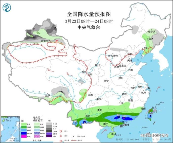3月23日08時至24日08時,新疆北部和西部山區(qū)、吉林中東部、西藏東北部等地部分地區(qū)有小到中雪或雨夾雪,其中,新疆北疆東部和伊犁河谷部分地區(qū)有大到暴雪(10~18毫米)。云南南部、華南、臺灣島等地部分地區(qū)有中到大雨,其中,云南東南部、廣西東部、廣東中部和東部、臺灣島中南部等地部分地區(qū)有暴雨或大暴雨(100~110毫米)。內蒙古西部、青海、新疆東部等地部分地區(qū)有4~6級風,其中,新疆東部部分地區(qū)有7~8級風(見圖3)。