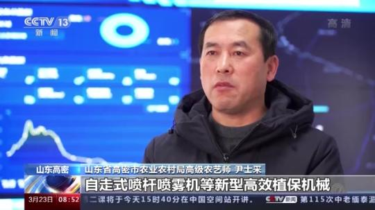 山東省高密市農(nóng)業(yè)農(nóng)村局高級(jí)農(nóng)藝師 尹士采:我們利用植保無(wú)人機(jī)、自走式噴桿噴霧機(jī)等新型高效植保機(jī)械,開(kāi)展小麥病蟲(chóng)草害統(tǒng)防統(tǒng)治,同時(shí)加強(qiáng)對(duì)農(nóng)戶(hù)、家庭農(nóng)場(chǎng)的指導(dǎo)服務(wù)。