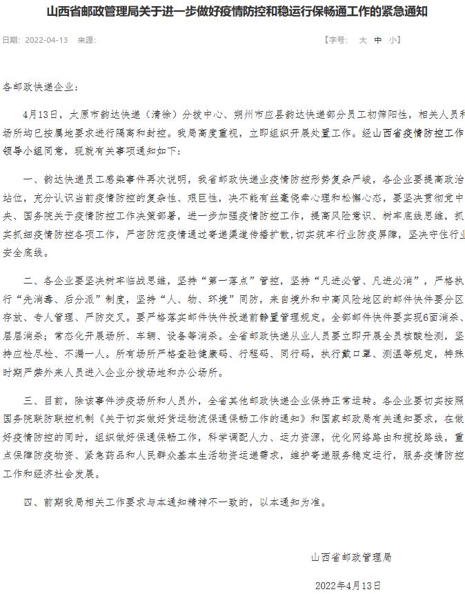 中新財經(jīng)4月15日電 13日,山西省郵政管理局發(fā)布通知緊急部署行業(yè)疫情防控和穩(wěn)運(yùn)行保通暢工作 ,要求全省從業(yè)人員要立即開展全員核酸檢測,堅持應(yīng)檢盡檢、不漏一人。除此次涉疫場所外,全省其他郵政快遞企業(yè)均保持正常運(yùn)轉(zhuǎn)。