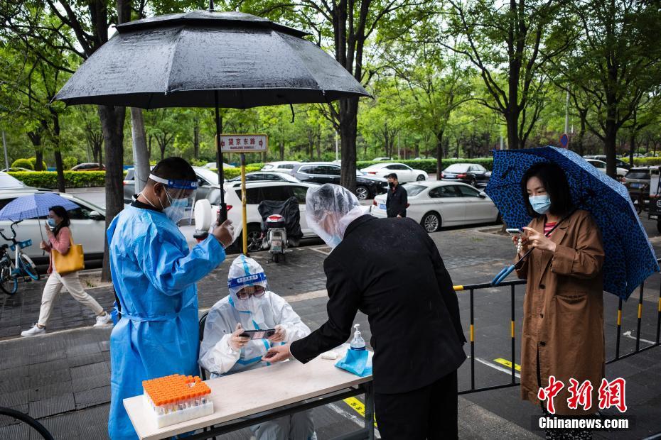 北京朝陽(yáng)區(qū)市民冒雨參加第二次常態(tài)化核酸檢測(cè)