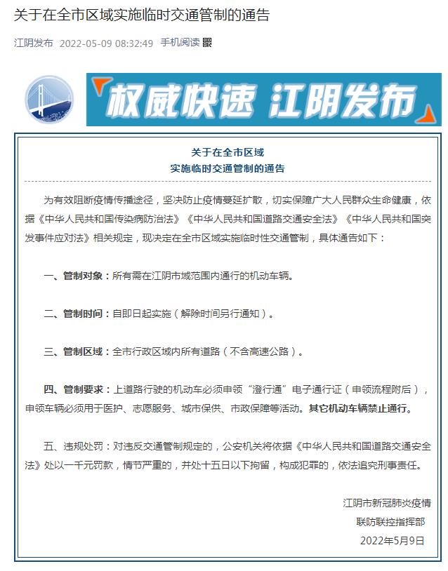 中新網(wǎng)5月9日電 據(jù)“江陰發(fā)布”微信公眾號(hào)消息,江蘇省江陰市新冠肺炎疫情聯(lián)防聯(lián)控指揮部9日發(fā)布關(guān)于在全市區(qū)域?qū)嵤┡R時(shí)交通管制的通告。通告稱,為有效阻斷疫情傳播途徑,堅(jiān)決防止疫情蔓延擴(kuò)散,切實(shí)保障廣大人民群眾生命健康,依據(jù)《中華人民共和國(guó)傳染病防治法》《中華人民共和國(guó)道路交通安全法》《中華人民共和國(guó)突發(fā)事件應(yīng)對(duì)法》相關(guān)規(guī)定,現(xiàn)決定在全市區(qū)域?qū)嵤┡R時(shí)性交通管制。
