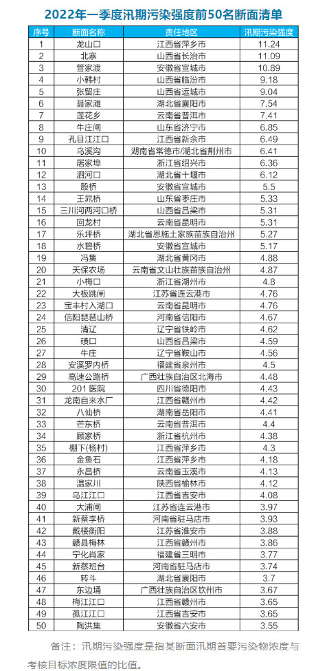 扣除自然因素影響,全國25個劣Ⅴ類斷面分布在12個省份。其中,云南省數量最多,為7個。22個水質明顯惡化斷面分布在13個省份。其中,安徽省數量最多,為4個。全國汛期污染強度較大的前50個斷面分布在15個省份,江西、湖北、云南省數量較多,占比為42.0%。其中,江西省萍鄉(xiāng)市龍山口斷面、山西省長治市北寨斷面、安徽省宣城市管家渡斷面汛期污染強度位于全國前三名。