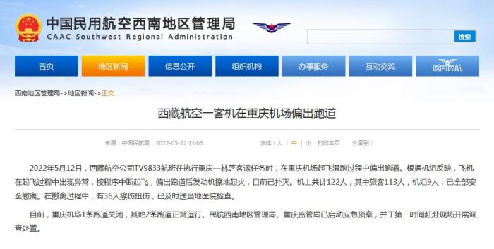 中新網(wǎng)5月12日電 據(jù)民航局網(wǎng)站消息,民航局今日就西藏航空一客機(jī)在重慶機(jī)場偏出跑道發(fā)布通報。通報稱,2022年5月12日,西藏航空公司TV9833航班在執(zhí)行重慶—林芝客運任務(wù)時,在重慶機(jī)場起飛滑跑過程中偏出跑道。根據(jù)機(jī)組反映,飛機(jī)在起飛過程中出現(xiàn)異常,按程序中斷起飛,偏出跑道后發(fā)動機(jī)擦地起火,目前已撲滅。機(jī)上共計122人,其中旅客113人,機(jī)組9人,已全部安全撤離。在撤離過程中,有36人擦傷扭傷,已及時送當(dāng)?shù)蒯t(yī)院檢查。
